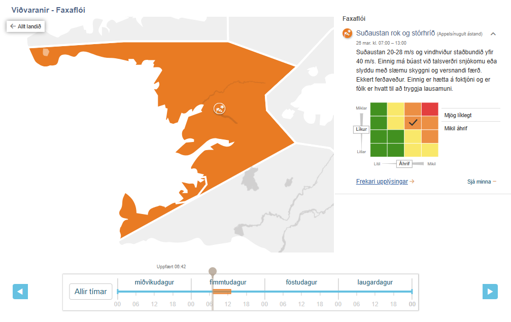 Í fyrramálið, fimmtudaginn 26.03.2026 milli klukkan 07:00-13:00 er appelsínugul viðvörun á okkar svæði.