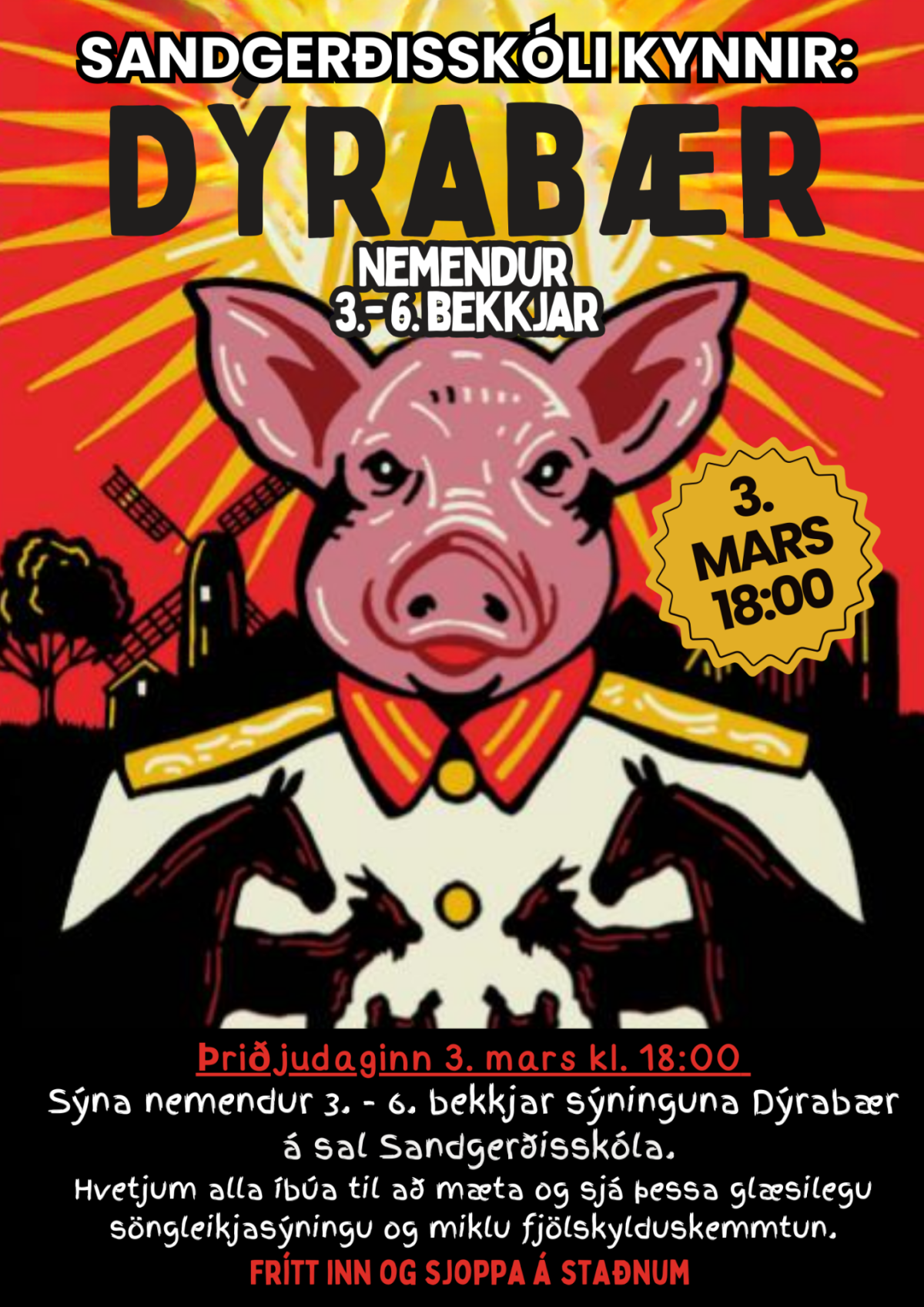 Árshátíð 3. - 6. bekkjar verður þriðjudaginn 3. mars og hefst kl.18:00 og ber heitið ,,Dýrabær". Handritið er byggt á sögu George Orwell - Animal farm, en handritshöfundur er Íris Valsdóttir og er leikritið söngleikur með íslenskum dægurlögum.