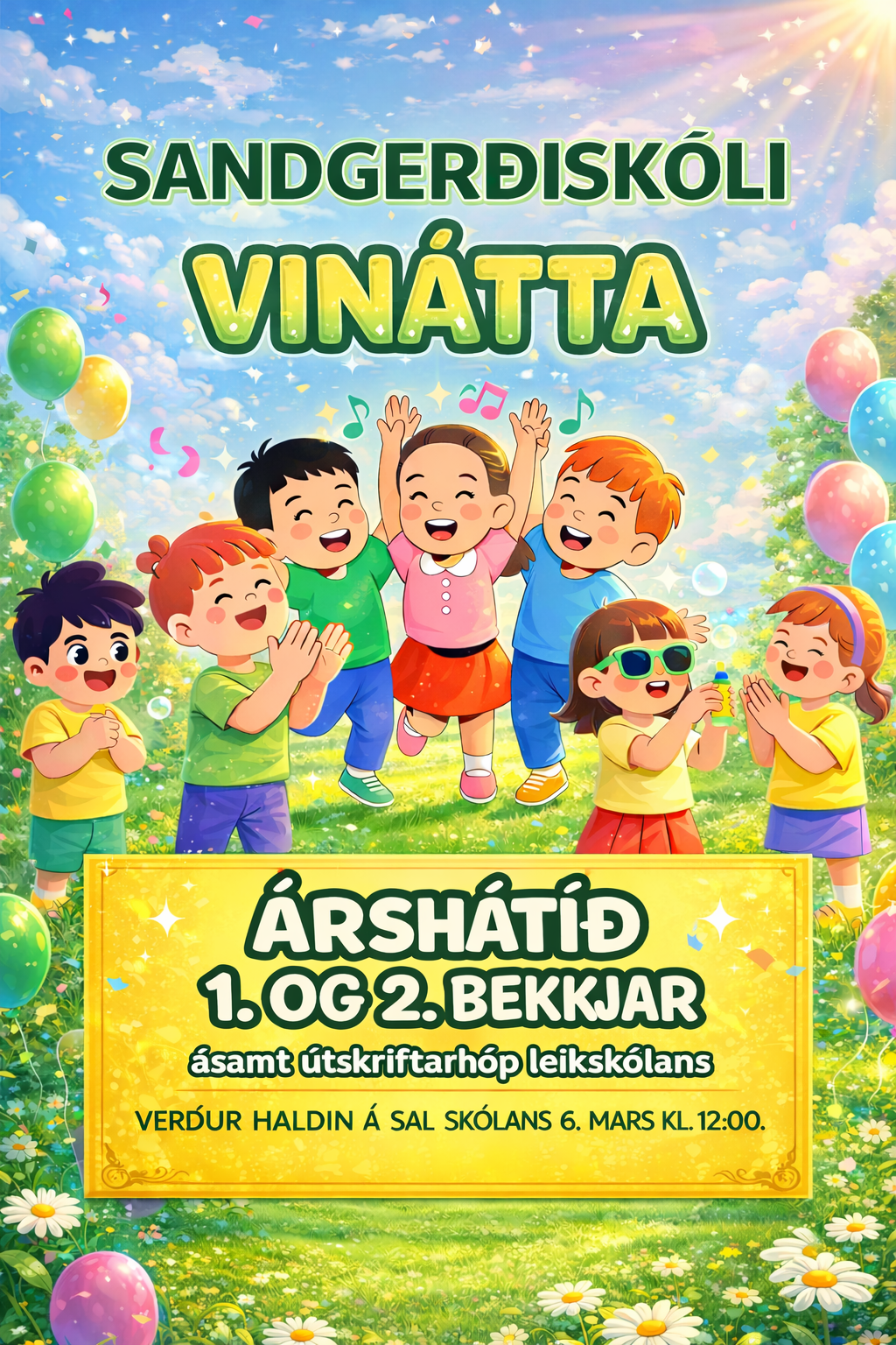 Árshátíð 1. og 2. bekkjar ásamt útskriftarhóp leikskólans er föstudaginn 6. mars kl. 12:00 og eru allir aðstandendur velkomnir á sýninguna. Áætlaður sýningartími er um 30 mínútur. Þema sýningarinnar er ,,Vinátta".