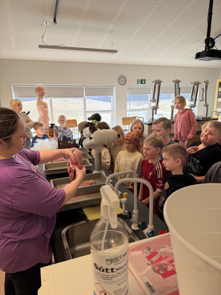 Fróðleiksfúsir nemendur komu í heimsókn í náttúrufræðistofuna til að skoða innyfli úr svíni. Nemendur í 1.–10. bekk tóku þátt í krufningunni og var gaman að sjá hversu margir sýndu mikinn áhuga á að fræðast nánar um líffærin.